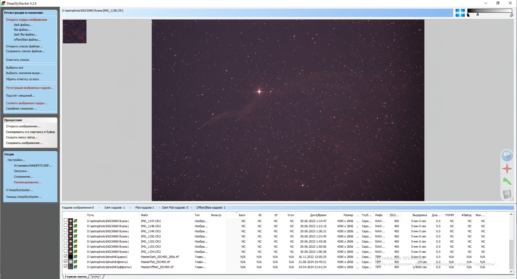 Откройте программу DeepSkyStacker. В меню слева загрузите основные кадры изображения и калибровочные кадры — можно кликать по соответствующим пунктам или просто перетащить файлы в окно программы.