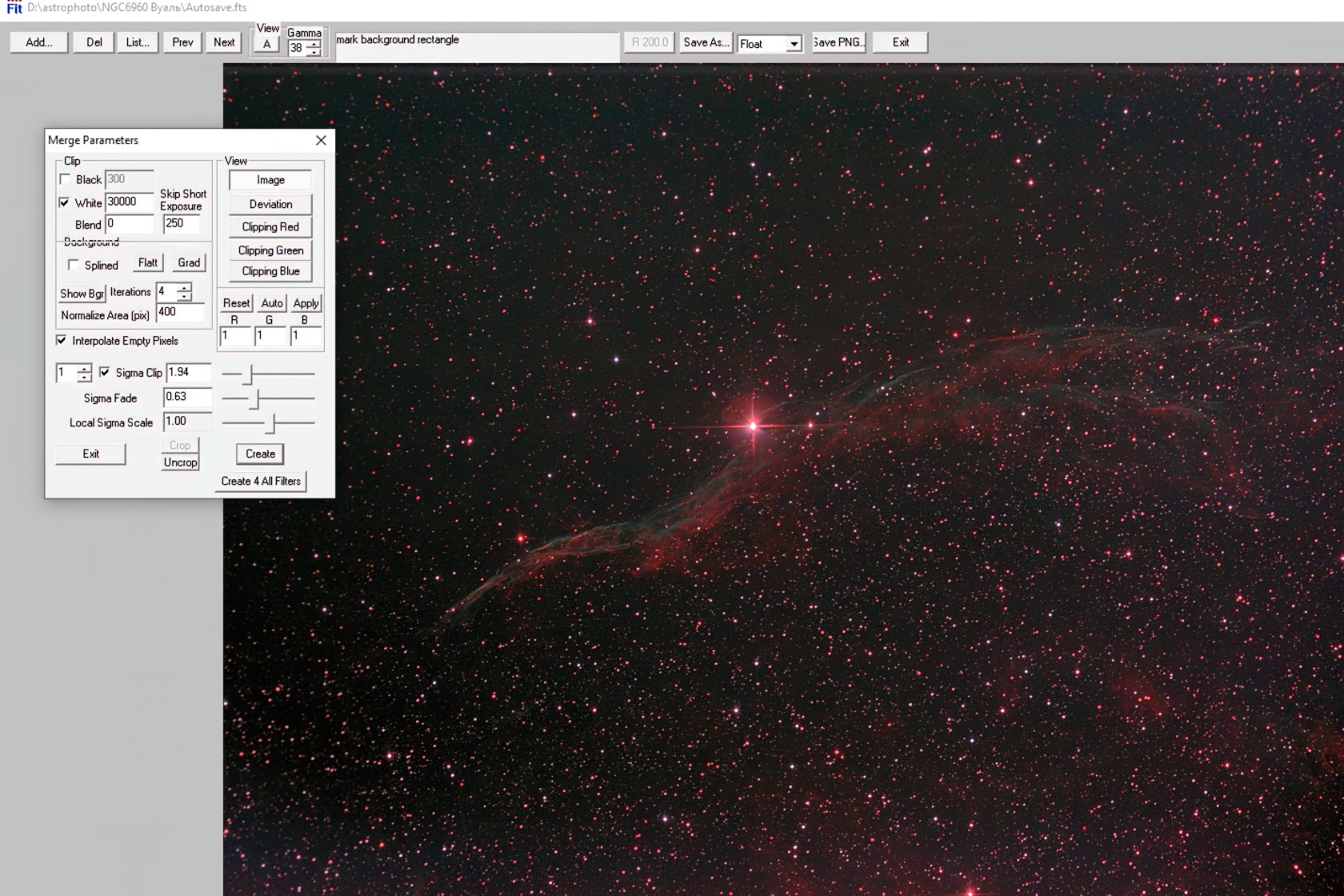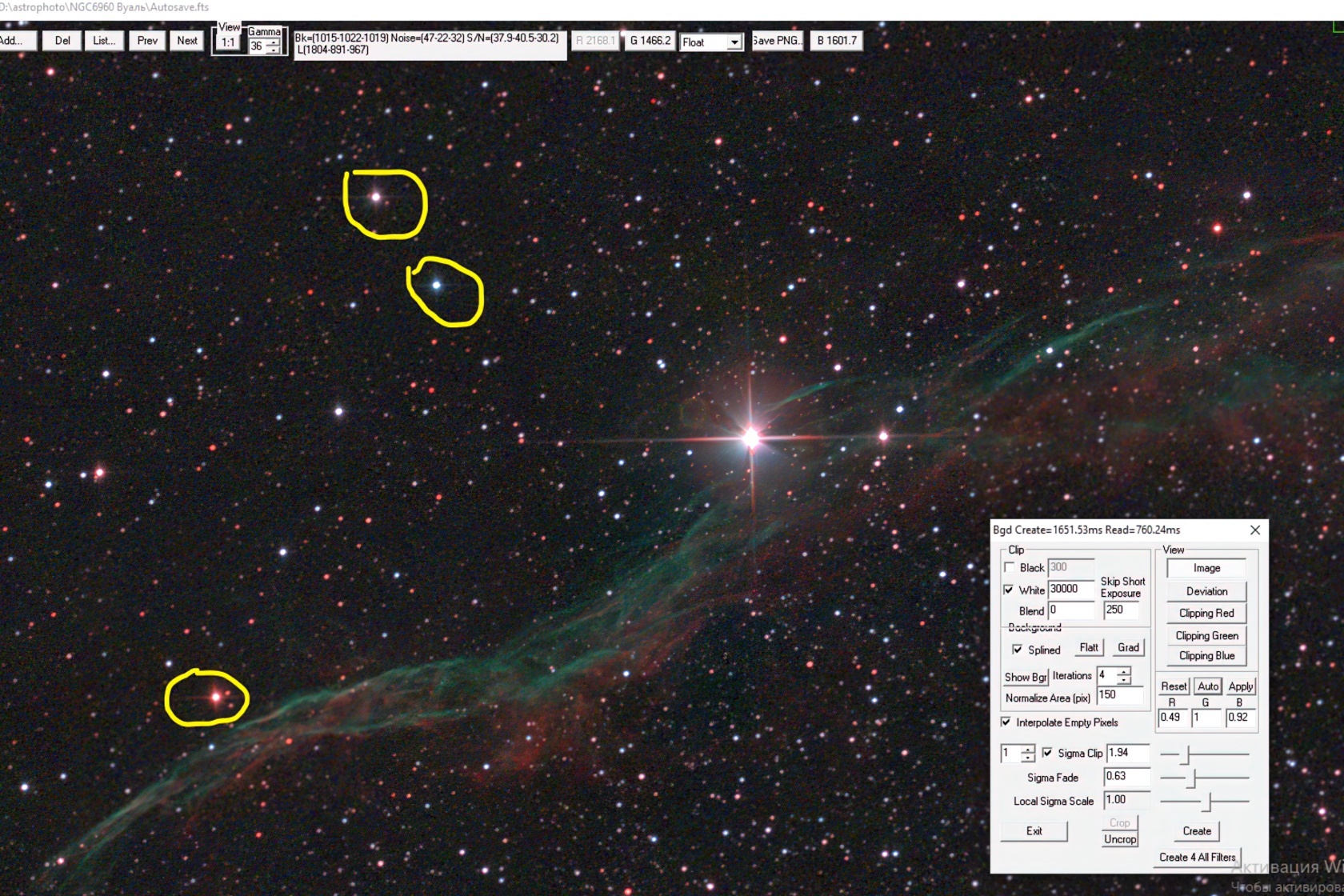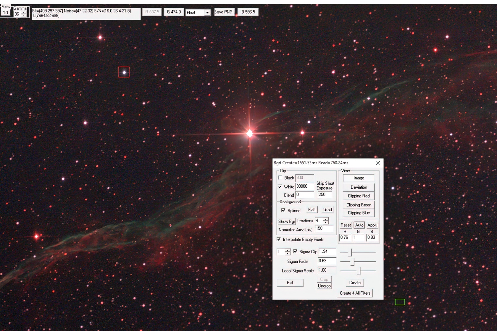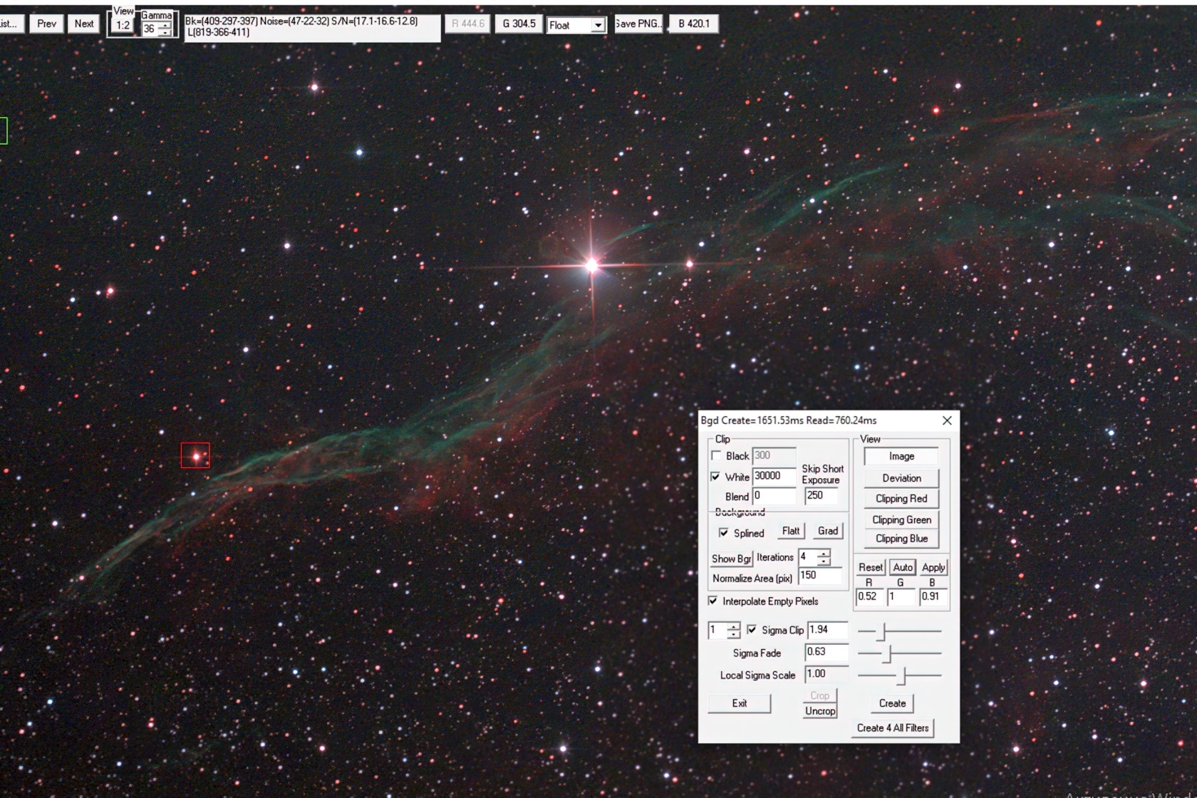 Чтобы выставить баланс белого, выберите звезду цвета, который преобладает в кадре (в нашем случае — красного). Не берите самые яркие звёзды с пересвеченным центром. После выбора нажмите Auto, и программа подкорректирует RGB каналы.