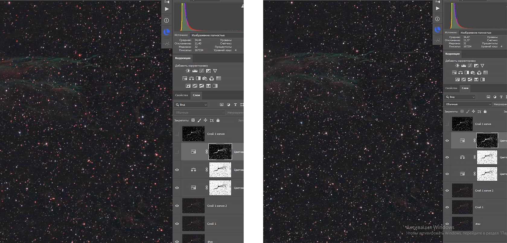 Так выглядит маска для звёзд. Если в ней остаются яркие участки объекта, закрасьте их чёрной кистью. Затем выделите звёзды и используйте этот слой как маску для кривых. С помощью точек белого и серого уменьшите яркость звёзд, но не переборщите, чтобы они не стали серыми. Ниже показан пример до и после коррекции света.