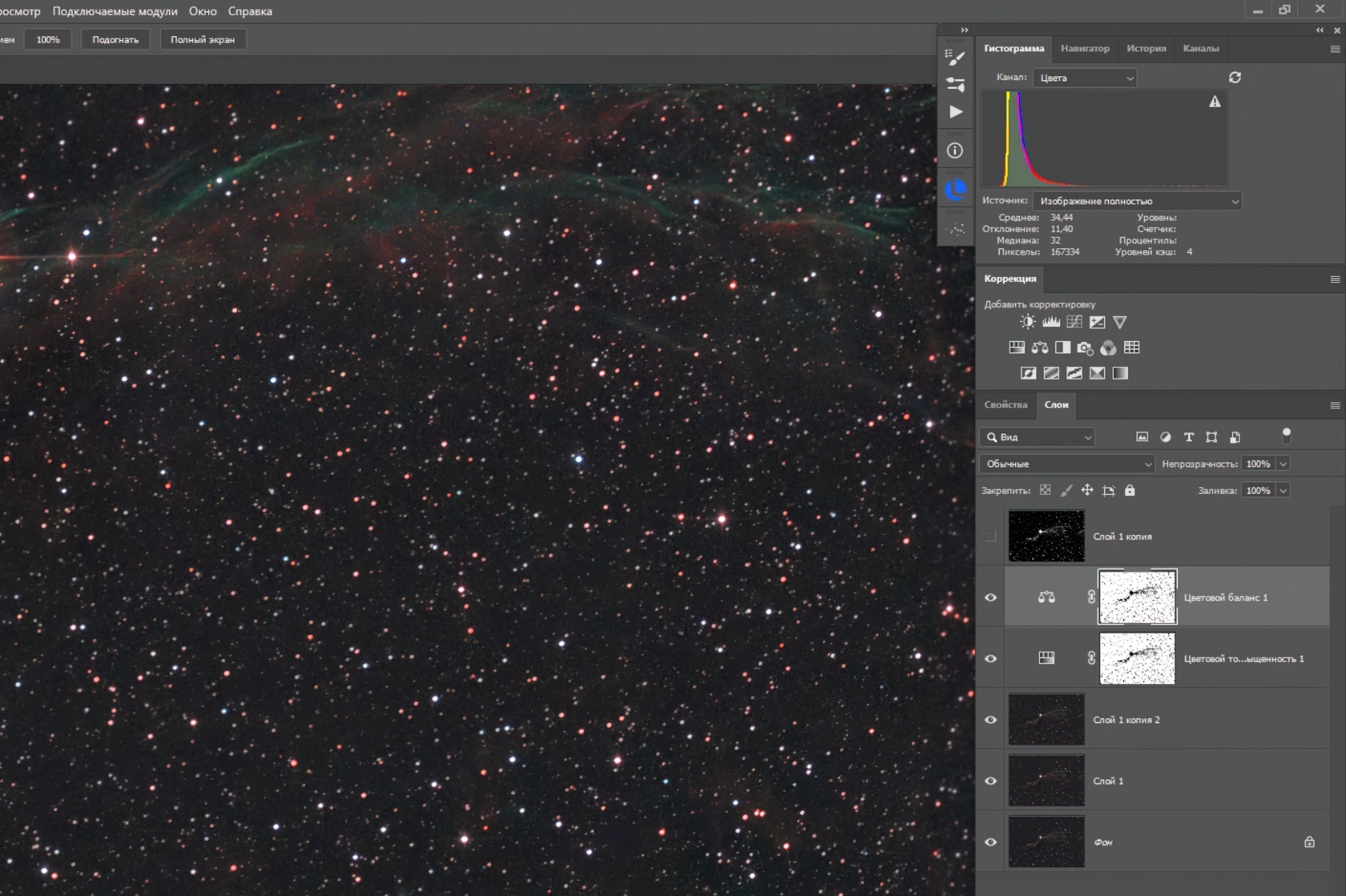 Получился хороший результат: туманность стала лучше разделяться по цветам, а звёзды заняли свои спектральные классы. Кроме жёлтых — они всё ещё выглядят красными. Попробуем настроить баланс белого, выбрав в качестве опорной синюю звезду.
