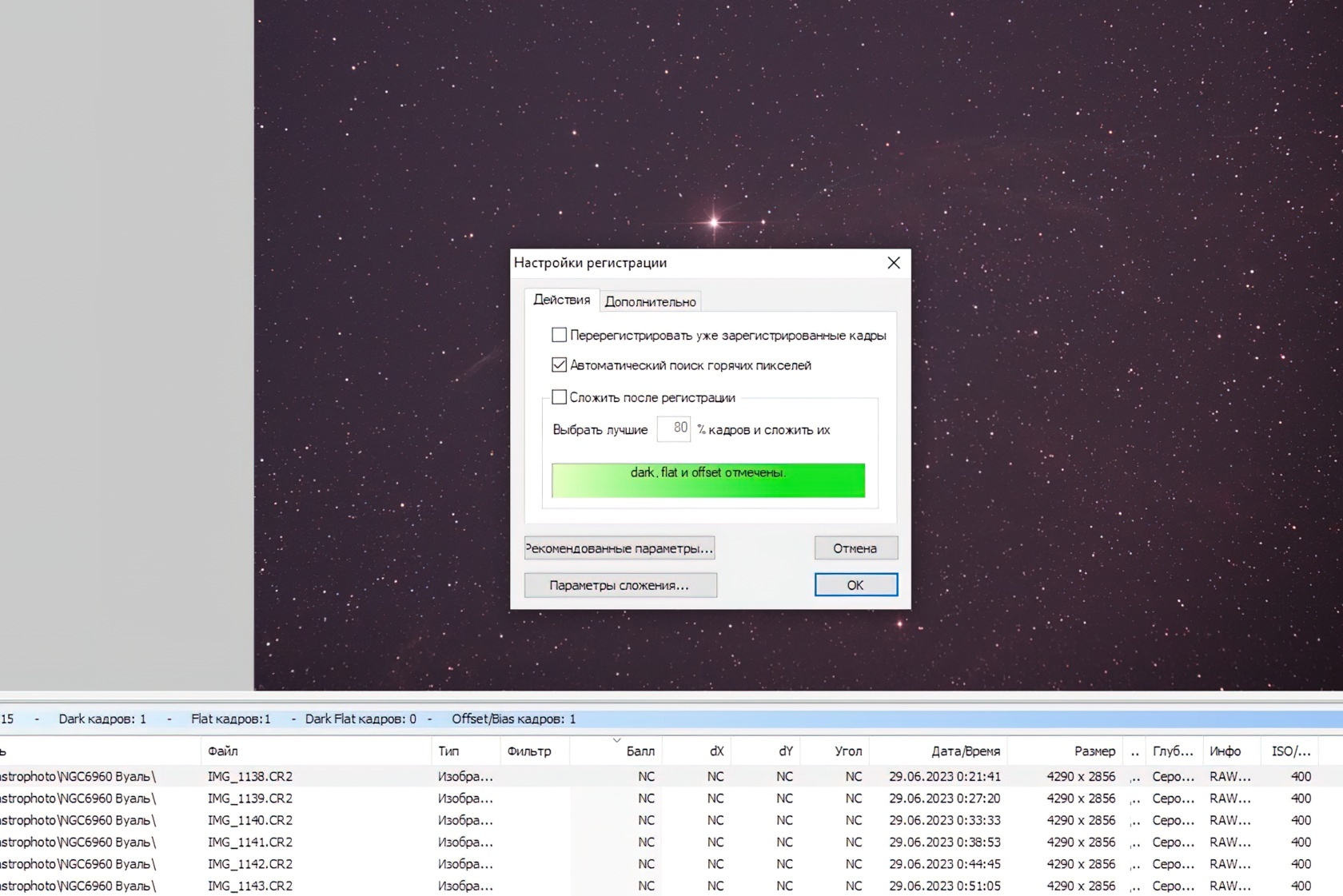 Затем нажмите «Сложить выбранные кадры», а в появившемся окне с информацией об итоговом стеке выберите «Параметры сложения».