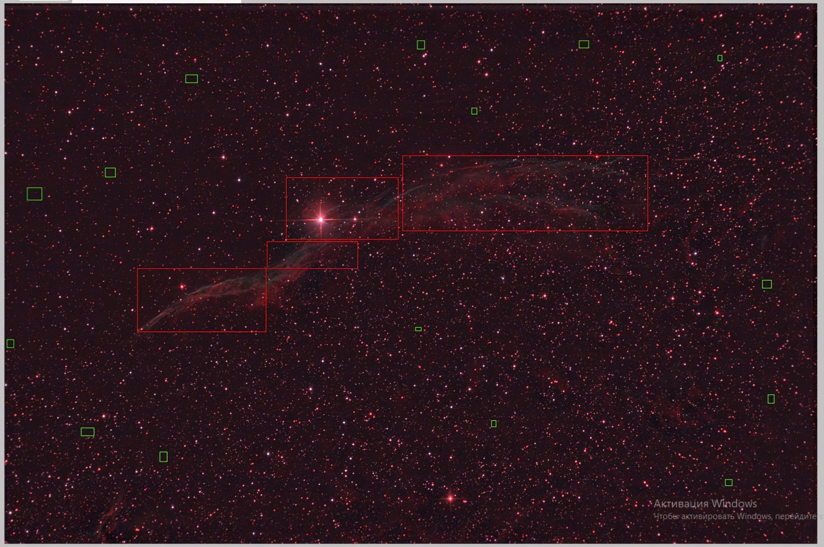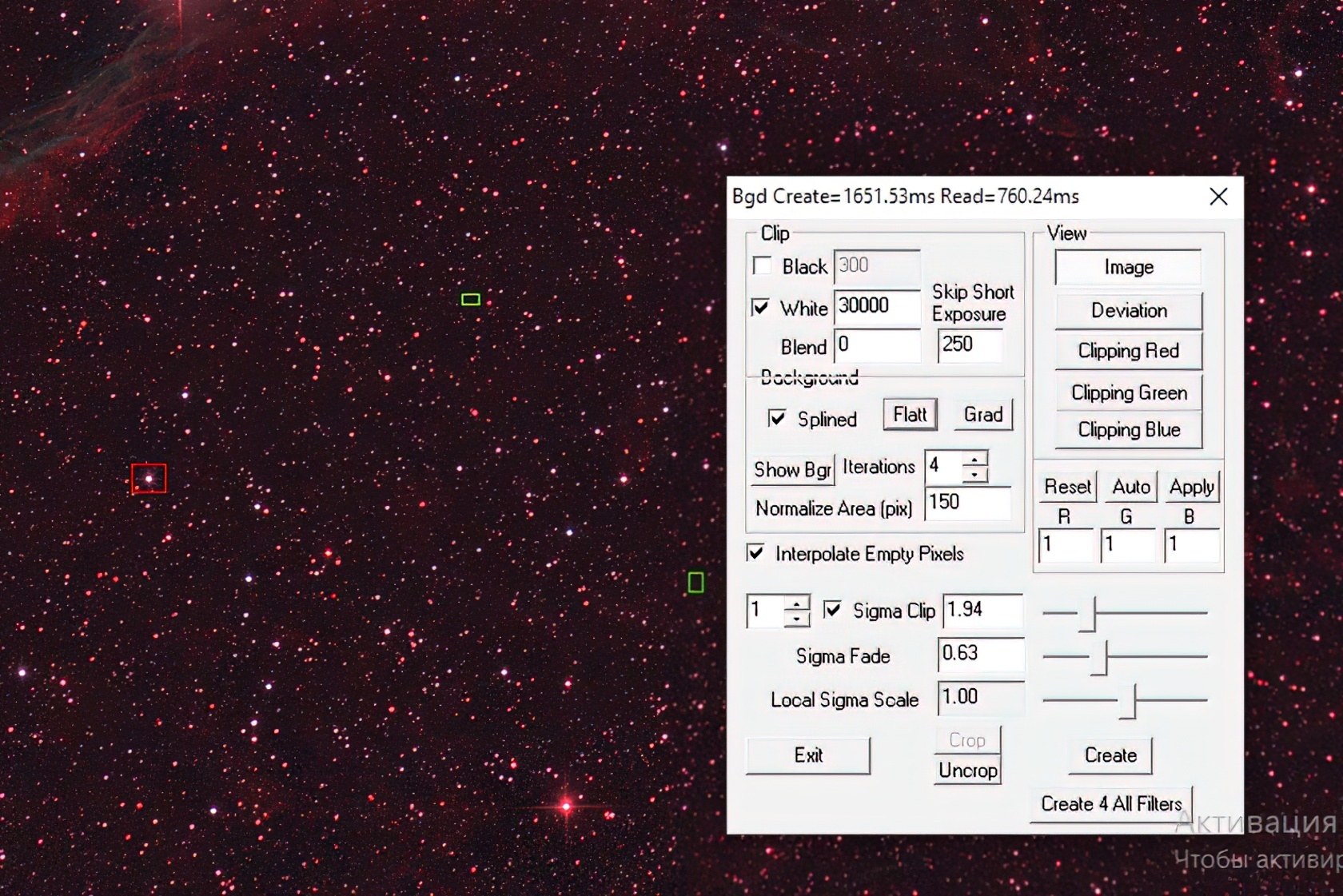 Чтобы начать выравнивание фона, нужно указать программе, где на фотографии находится полезный сигнал, а где — фон тёмного неба. Для этого выделяйте мышкой области изображения: красными квадратами — зоны с сигналом, зелёными — зоны с фоном. Удерживая клавишу Shift, можно добавить несколько таких квадратов по всему кадру.