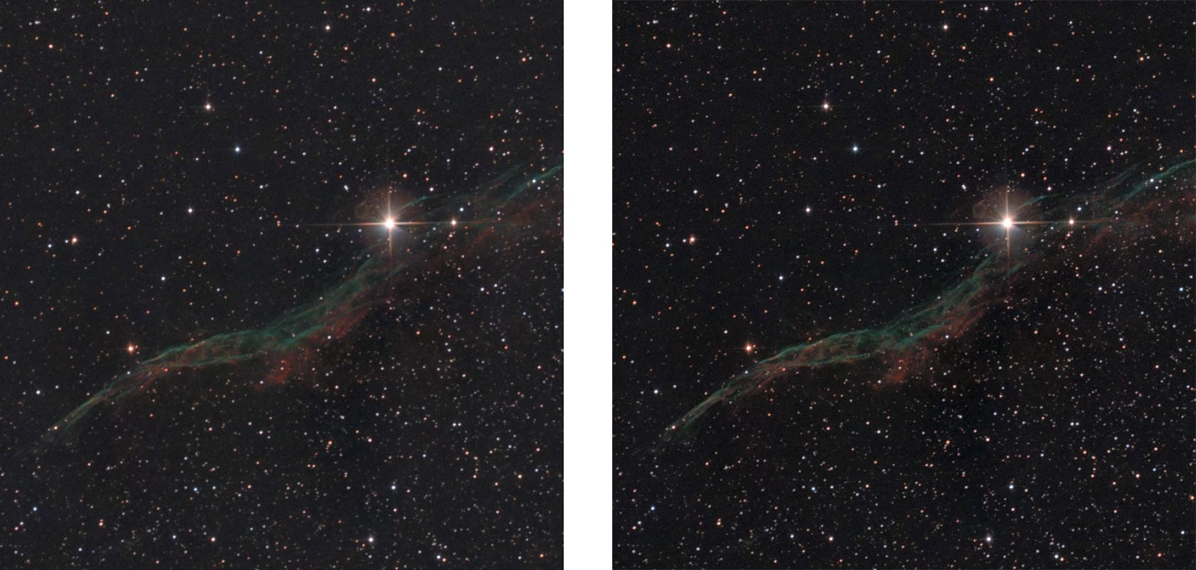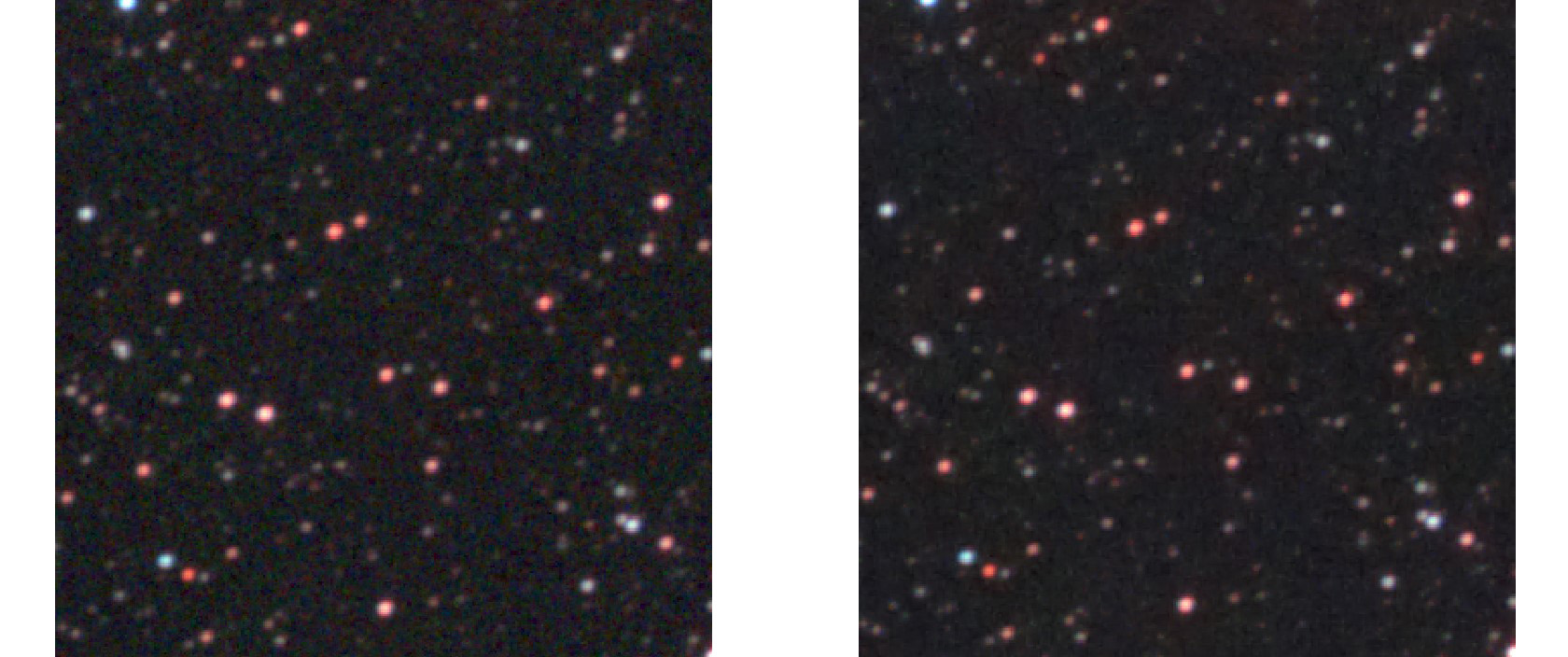 С помощью яркостной маски можно отделить фон от звёзд и объекта съёмки, а затем снизить шум фона встроенными инструментами или внешними плагинами. Поскольку фон не содержит полезного сигнала, иногда шумодав применяют на максимум, добиваясь полностью гладкой картинки. Делать так не стоит — результат часто выглядит как пластилиновый фон с резкими краями звёзд и различными артефактами. Лучше снижать шум в несколько проходов. Ниже показан пример обработки фона шумодавом.