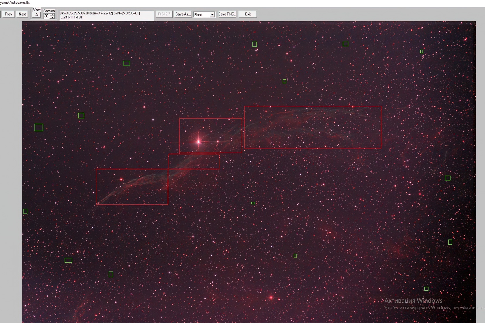 На примере видно, что правая часть кадра заметно темнее, а нижняя — светлее. Образцы полезного сигнала (красные квадраты) берутся в местах, где виден сам объект съёмки. Если он занимает небольшую часть кадра (галактика, шаровое скопление, планетарная туманность), достаточно выделить его одним квадратом. Но для крупных объектов, как в данном случае с туманностью, полезно проставить несколько красных квадратов по разным участкам.