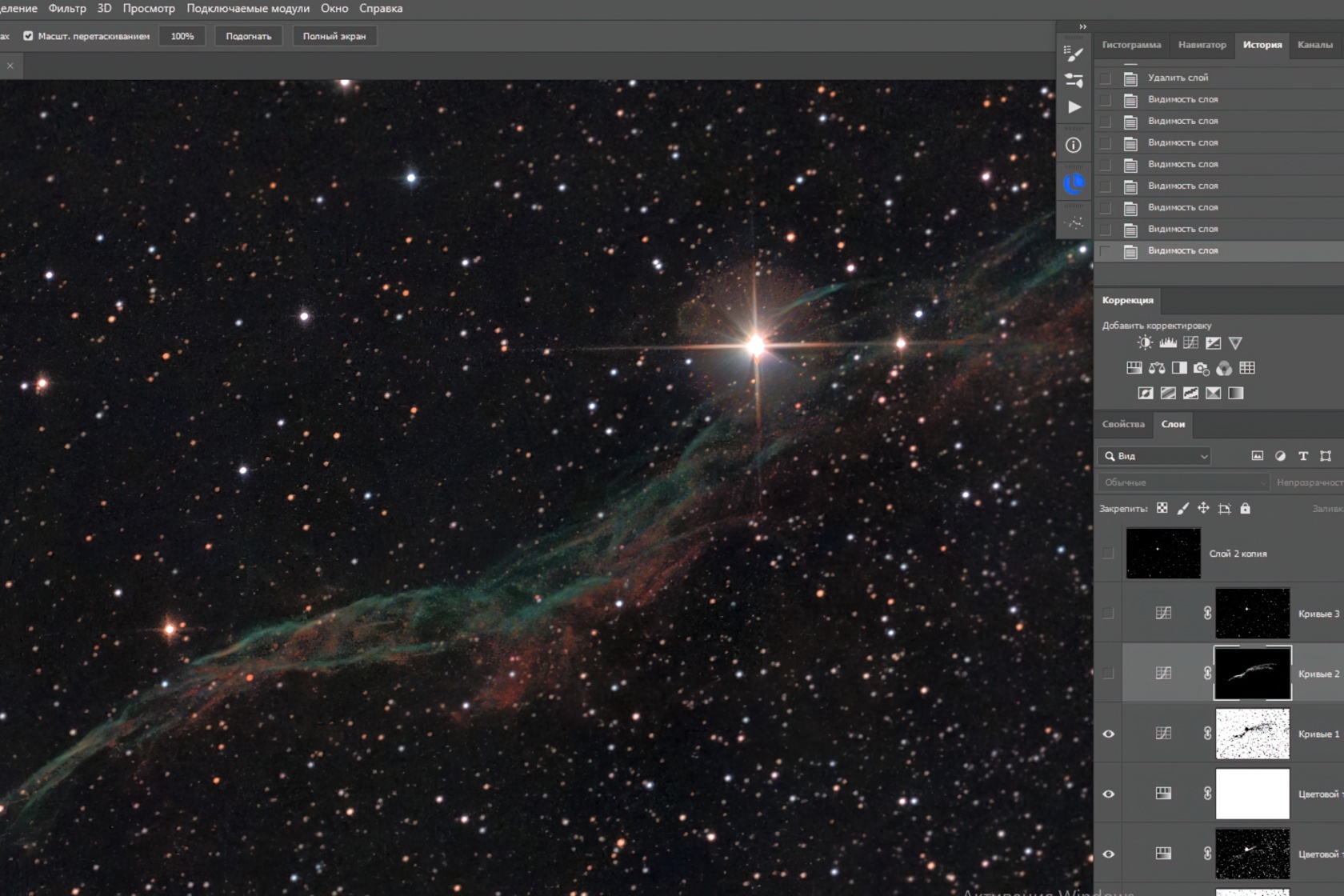 На этом этапе обработку можно завершить: мы убрали шум, скорректировали яркость и цвет фона, а также сделали акцент на самом объекте. Результат можно оставить как есть или доработать по своему вкусу. Осталось придумать яркую историю о съёмке, уточнить номер объекта по каталогу и указать дату и место съёмки. И вперёд — делиться красотой со всеми!