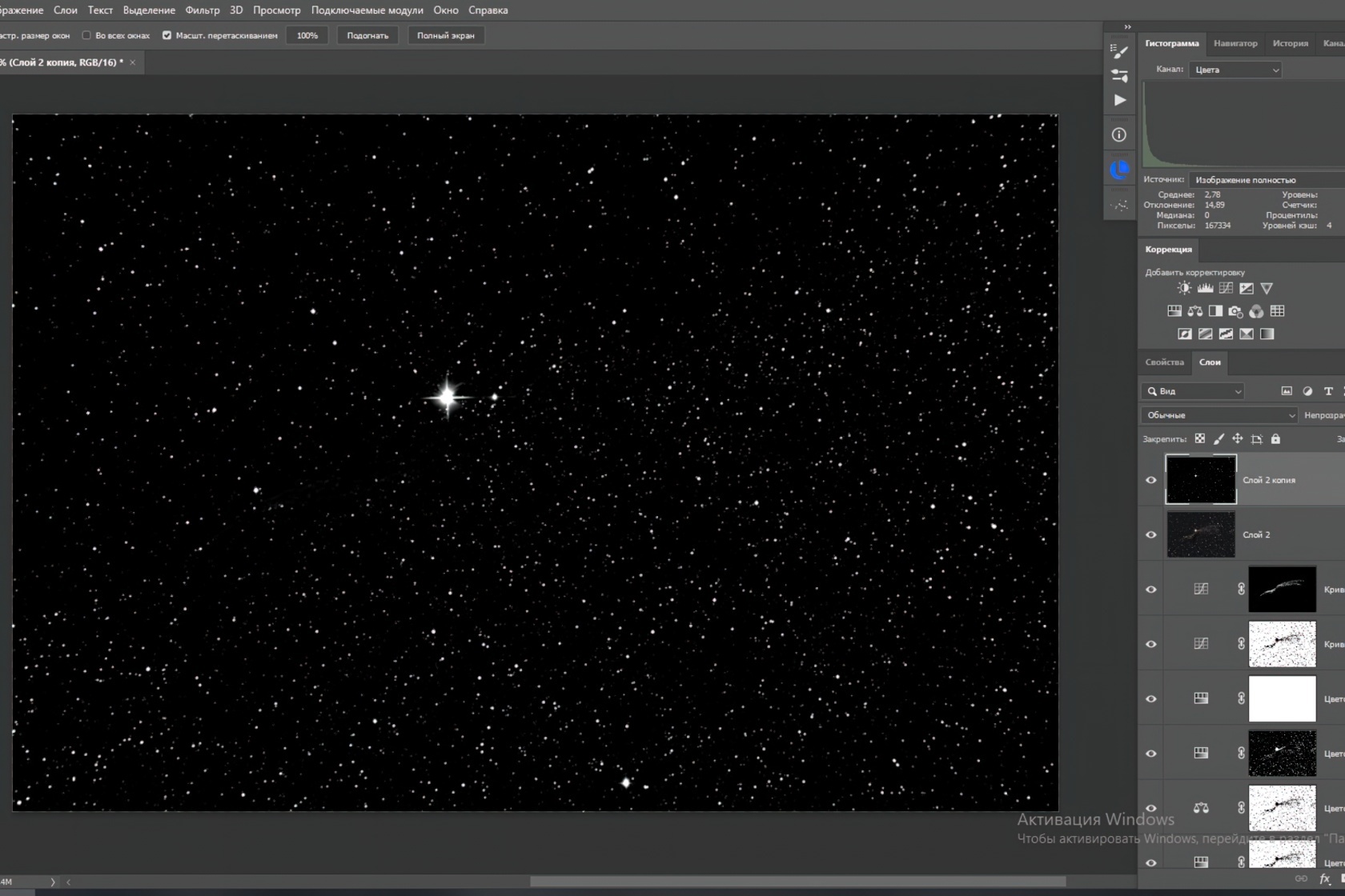 Используя копию слоя с кривыми для фона, но с инвертированной маской, можно добавить яркости самому объекту. Перед этим уберите звёзды с маски, чтобы они не стали слишком яркими. Яркость звёзд, наоборот, можно немного снизить — для этого создаём отдельную яркостную маску, в которой останутся только самые яркие звёзды, не затрагивая объект.
