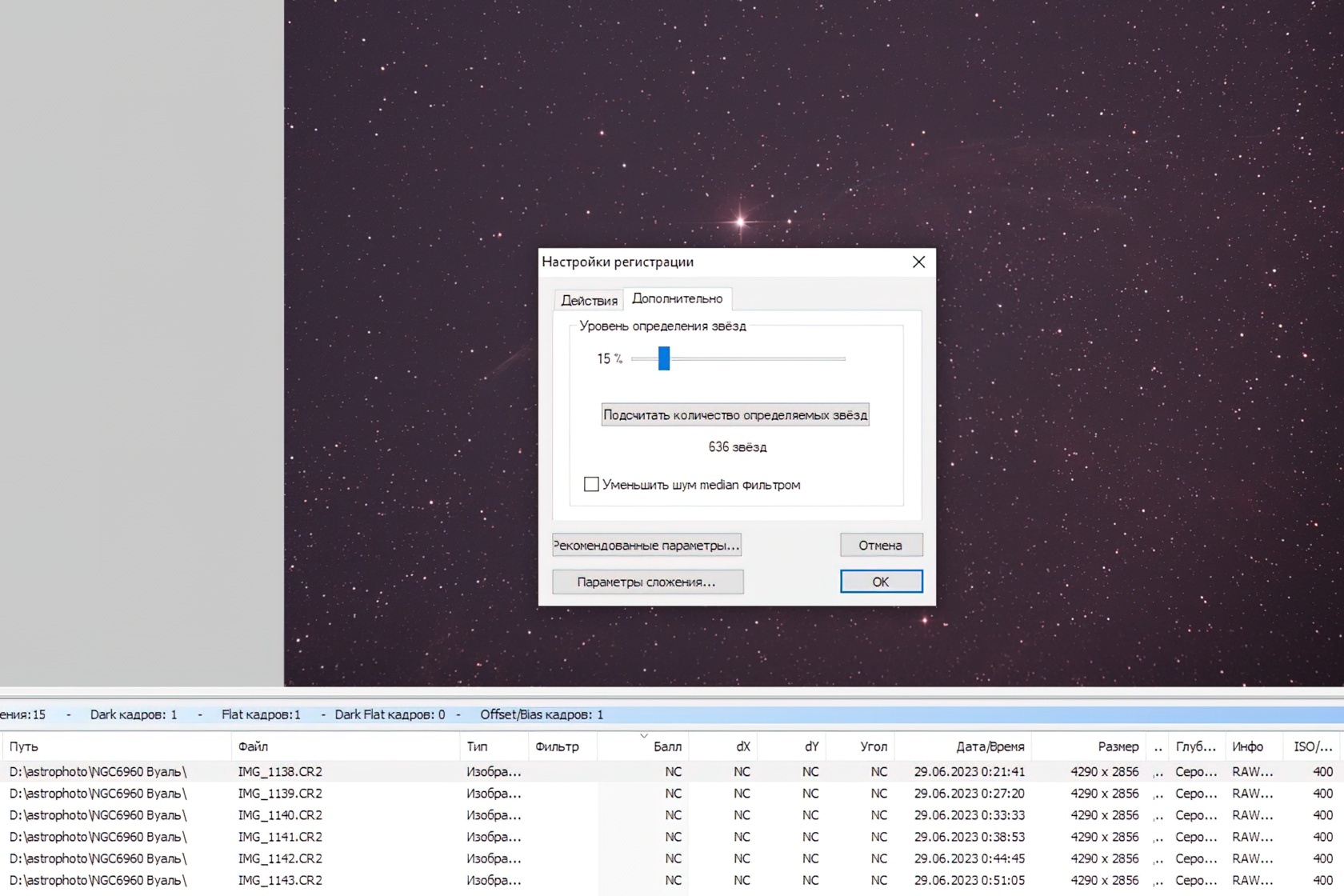 Во вкладке «Дополнительно» можно задать порог определения звёзд — значение, при котором яркая точка в кадре будет считаться звездой, а не шумом или битым пикселем. Этот параметр подбирается опытным путём для каждой фотографии. Не ставьте его слишком низким (когда программа показывает по 2–3 тысячи звёзд и больше).