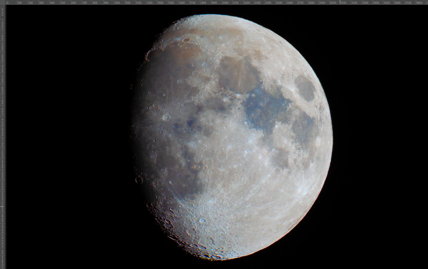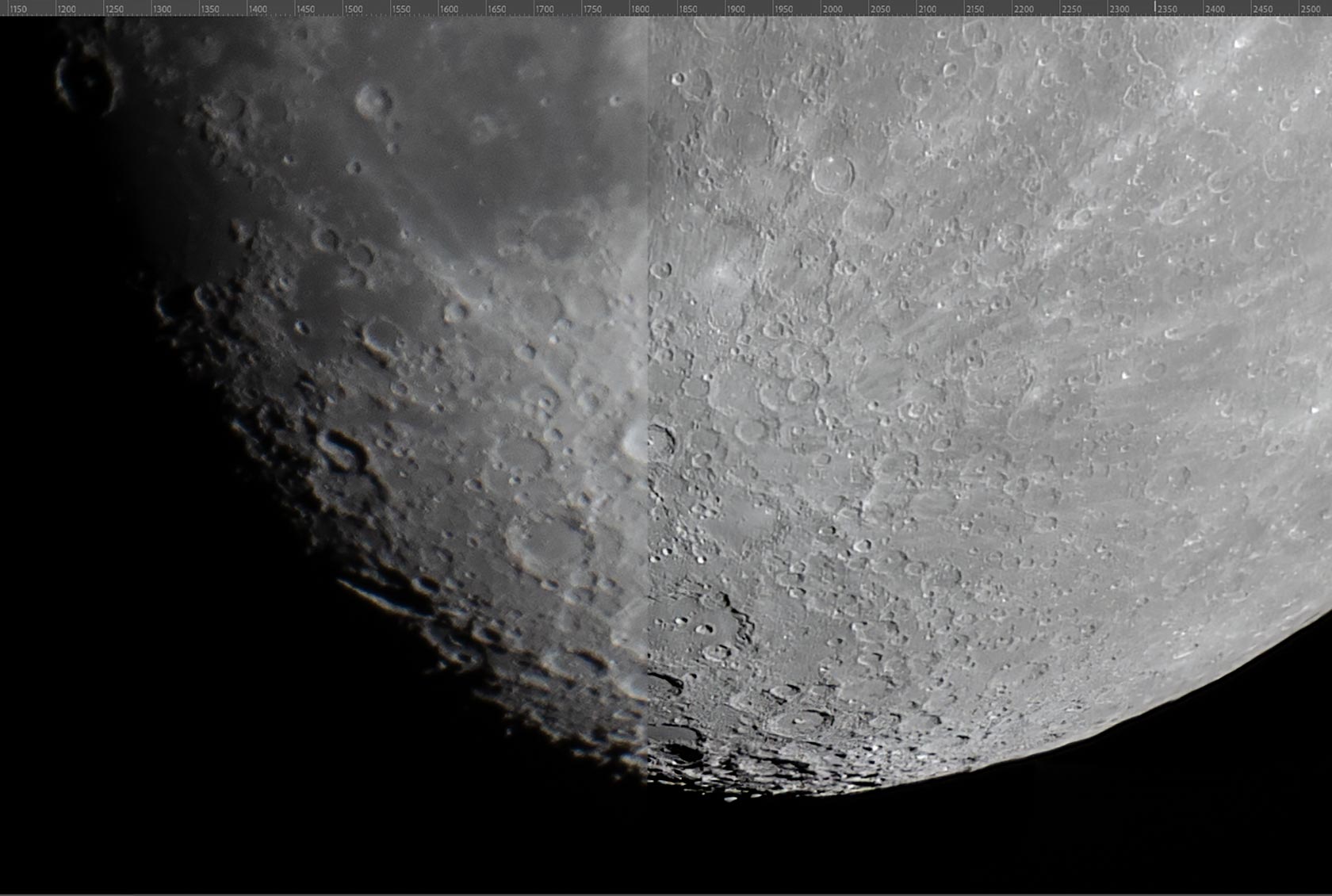 Открываем полученный результат после AstroSurface (будем называть его «стек»). По желанию можно добавить цвет Луне. Для этого открываем любой одиночный кадр (в RAW) и накладываем поверх стека. Кстати, можно заметить, насколько отличается детализация стека и одиночного кадра, всё-таки не зря были проделаны все предыдущие действия.
