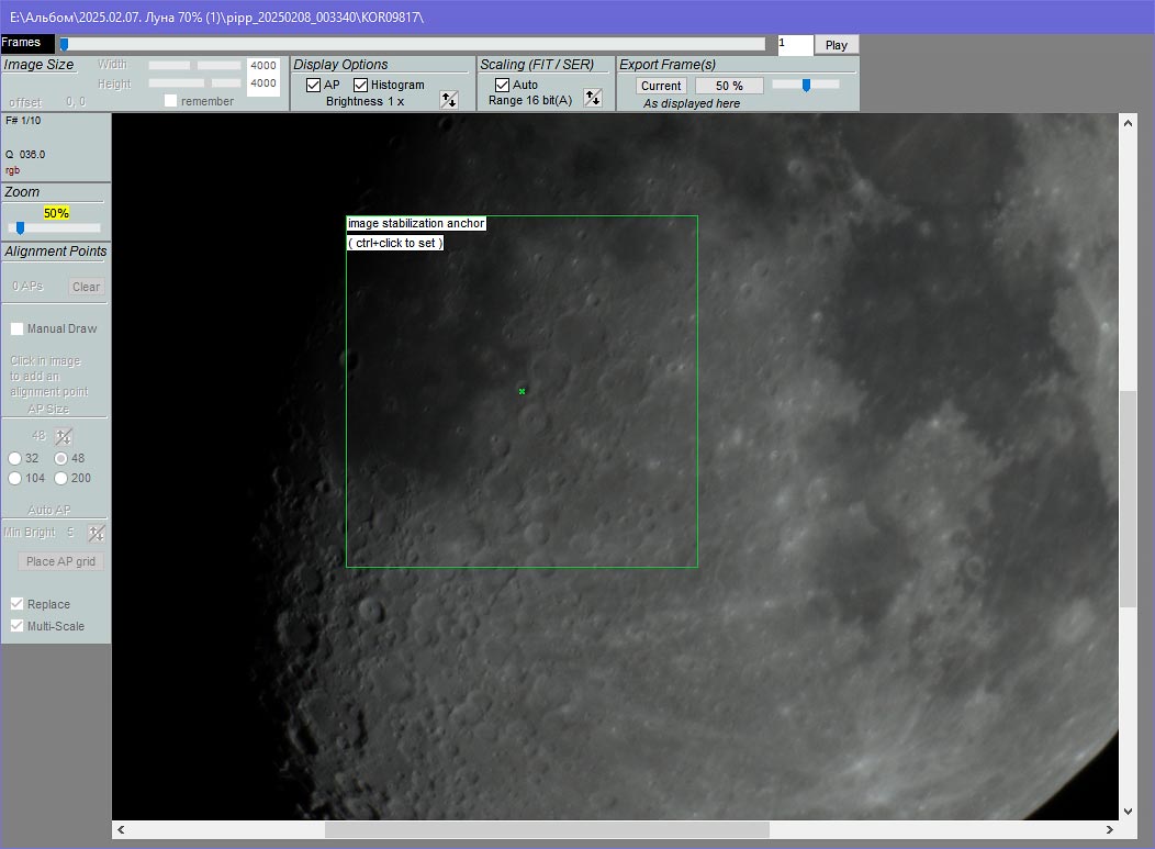 Открыв изображения, мы увидим окно с превью и зелёным квадратом-якорем. С зажатым Ctrl кликаем на наиболее контрастный участок на диске Луны. Это необходимо, чтобы ещё раз выровнять изображения относительно друг друга.