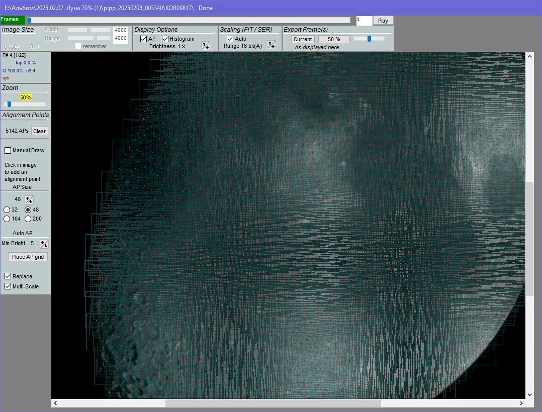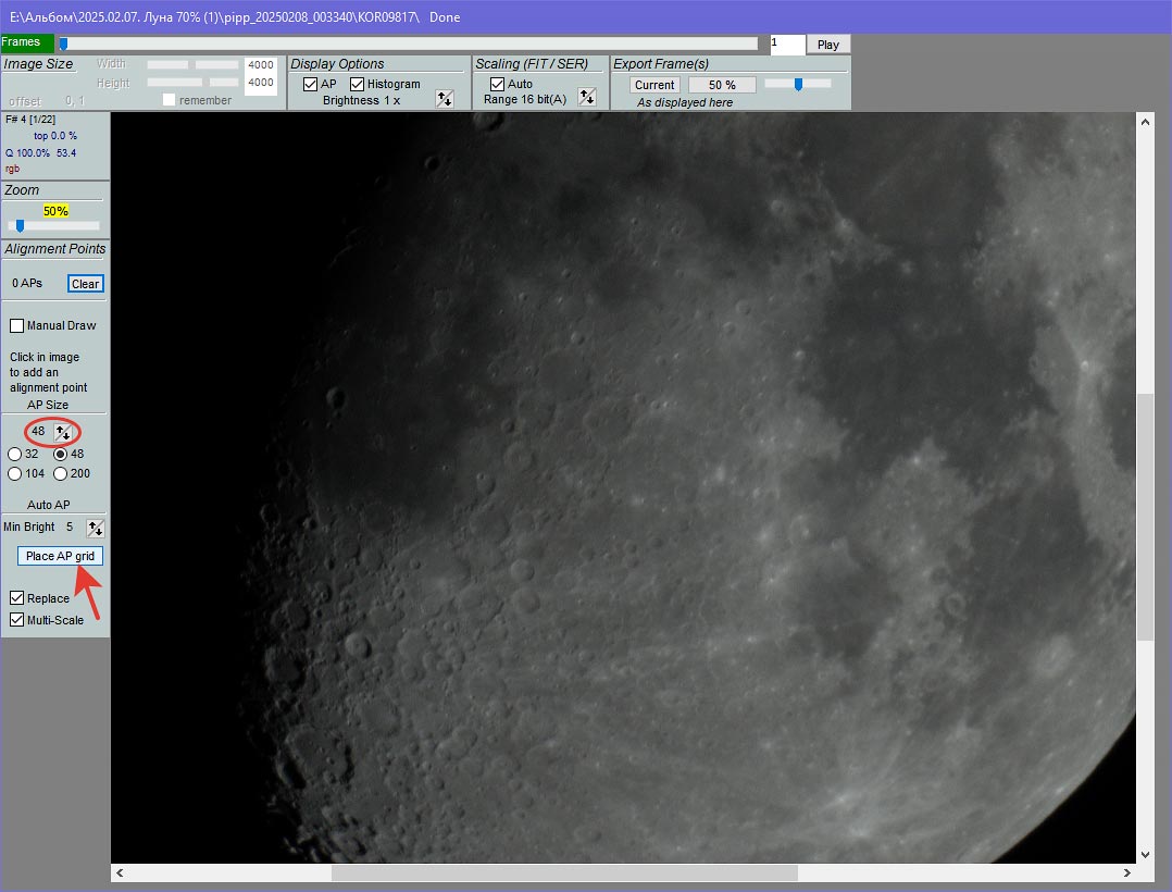 В левой части превью выбираем размер контрольной точки и нажимаем «Place AP grid». Программа расставит точки по всему диску Луны, чуть выше будет написано их количество. Чтобы уменьшить время сложения, советую подобрать такой размер контрольных точек, чтобы их количество не превышало 5000–7000.