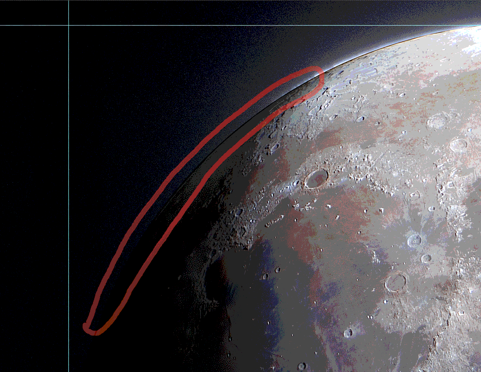 Область, выделенная красным, — поверхность Луны «с деталями» — наша самая первая серия кадров.