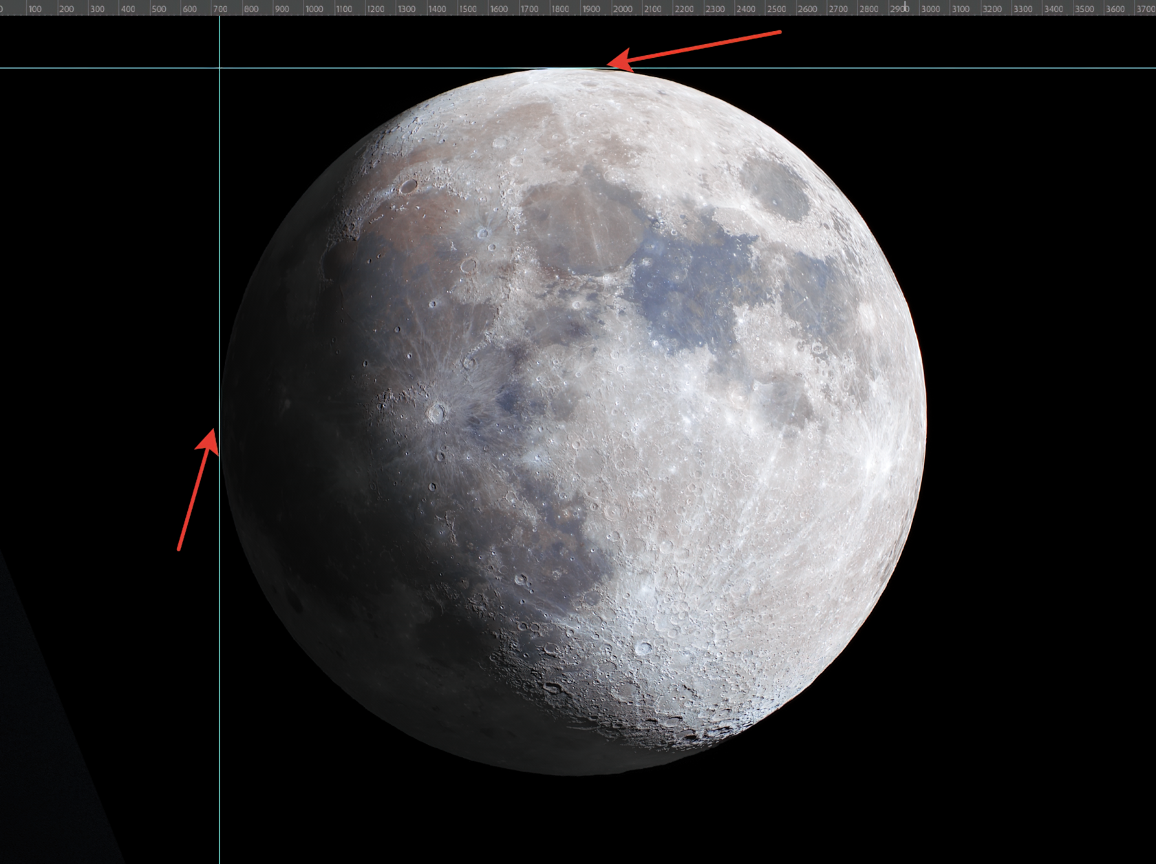 Если появились подобные чёрные границы, переделываем маску, точно так же протянув круглую область выделения из пересечения направляющих. В идеале должен выйти круг, который вырежет Луну ровно по контуру.