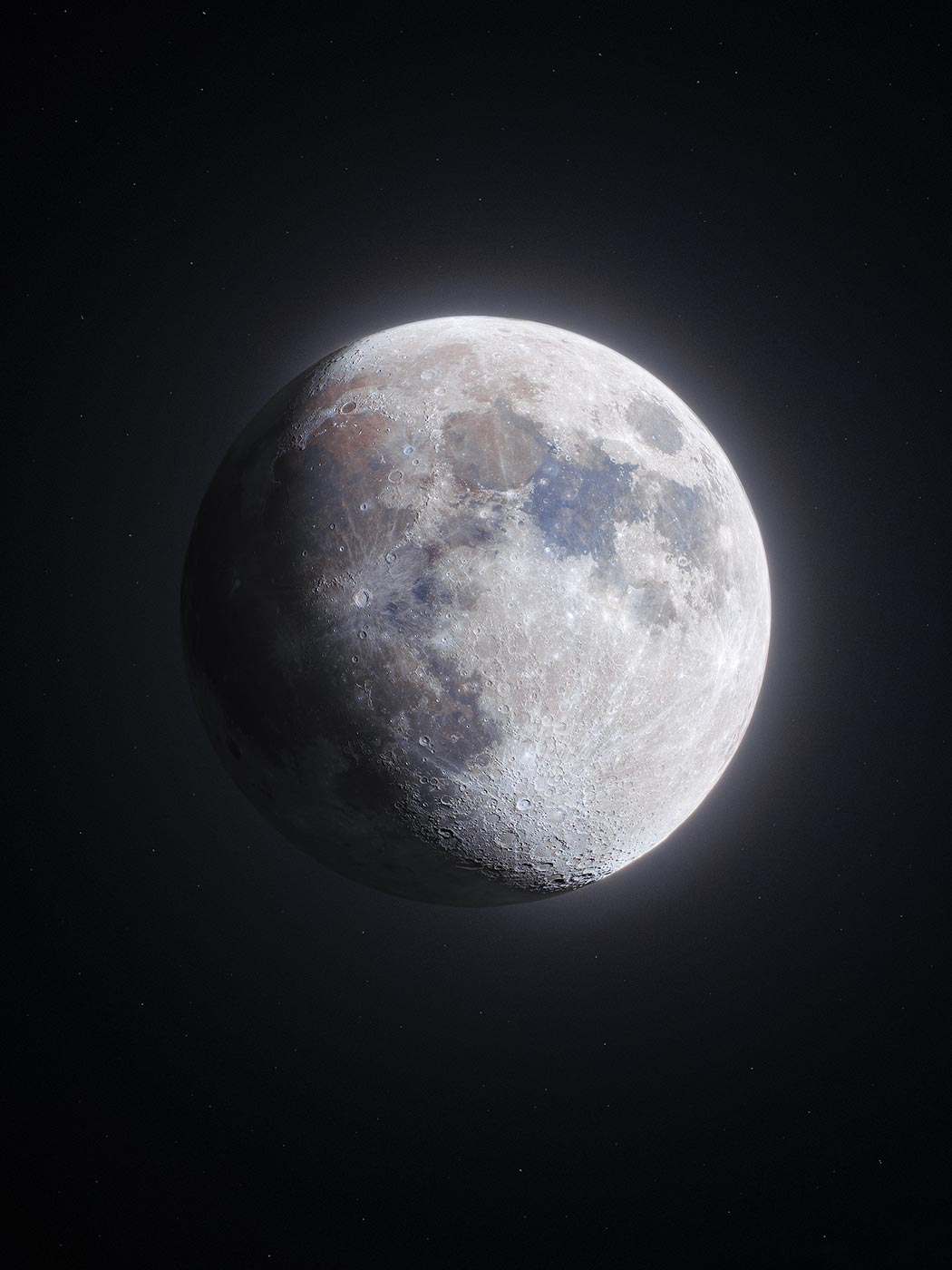При желании можно наложить звёзды, так же, как и полнолуние, отснятые ранее. Но в идеале, создавая максимально правдоподобное изображение, надлежит снимать звёзды на том же фокусном расстоянии в той же области неба, где находилась Луна в момент съёмки первой серии, а так как такая возможность есть далеко не у всех (я в том числе), можно немного схитрить и добавить любые имеющиеся в архиве звёзды. Для этой цели я выбрал серию кадров по области газопылевых облаков в области Цефея. Предварительно сложил около 150 кадров в программе DeepSkyStacker, отделил звёзды от фона в PixInsight и наложил поверх Луны. Не буду прикладывать скриншоты, так как, скорее всего, возникнет немало вопросов, а обработка фотографий глубокого космоса — это уже тема отдельной статьи.