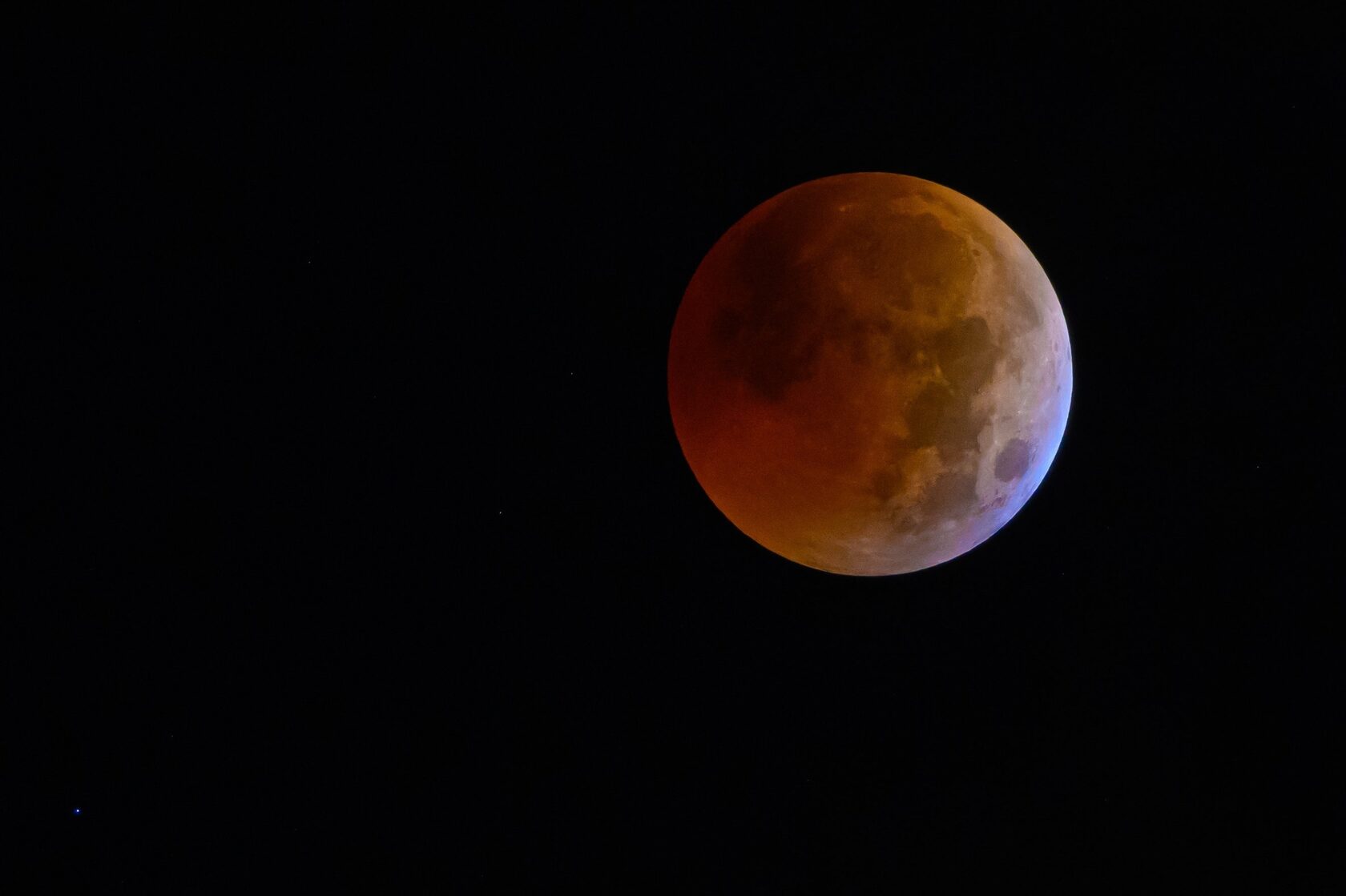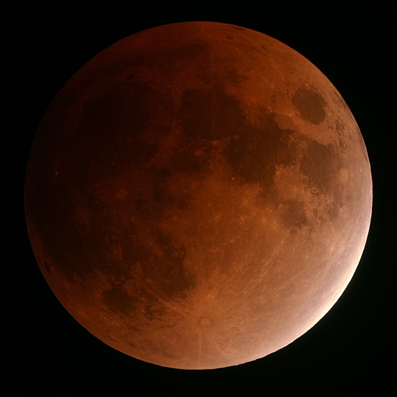 - Максимальная фаза (21:12). Наибольшее погружение Луны в тень, цвет обычно самый насыщенный и равномерный.