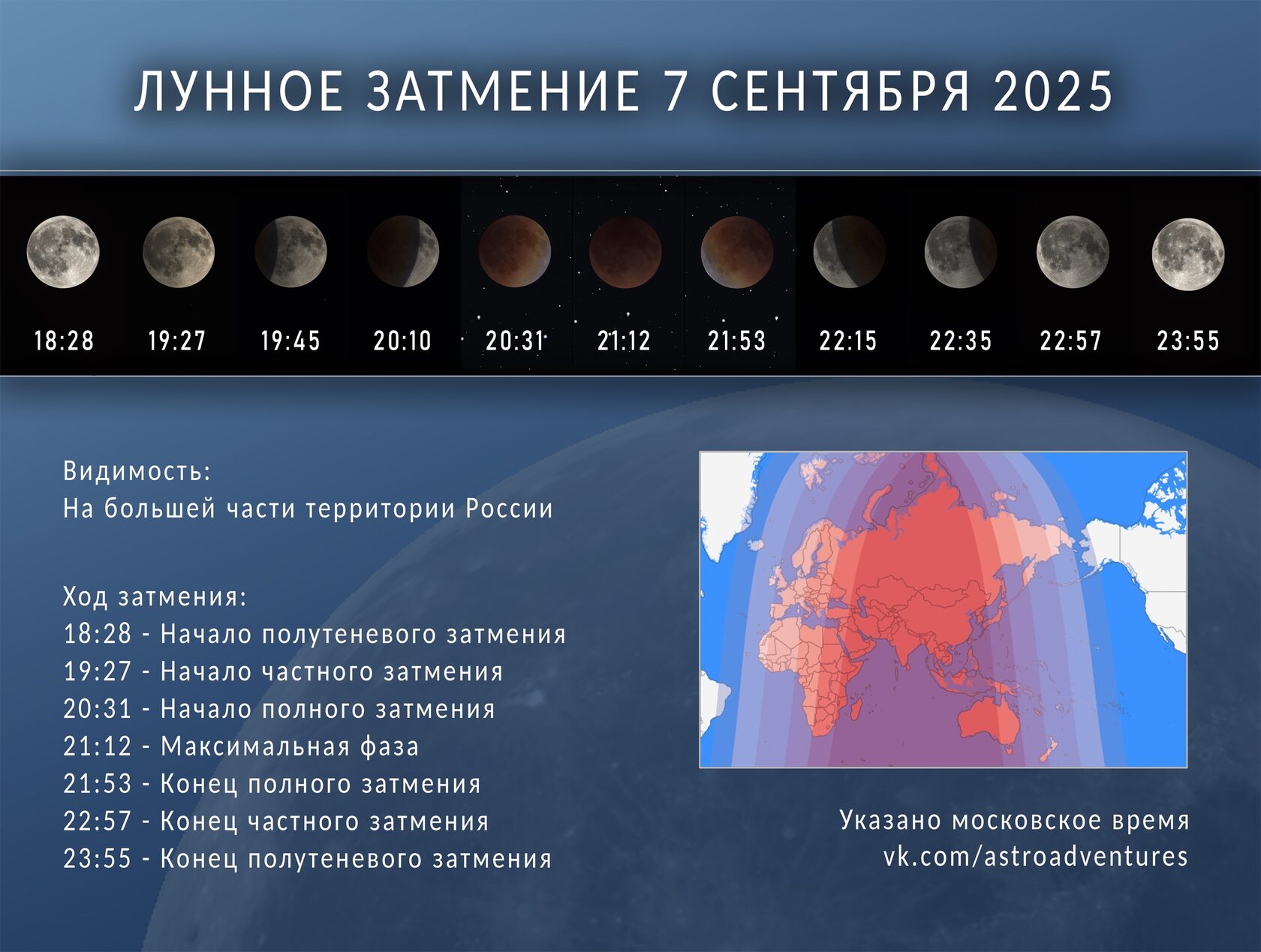 Общая длительность всего затмения — 5 часов 27 минут, с 18:28 до 23:55.