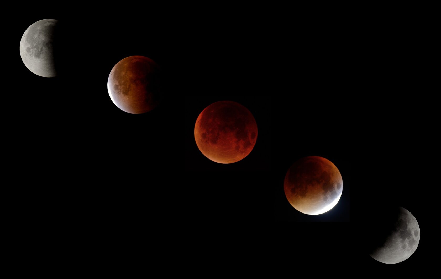 - Начало частного затмения (19:27). Луна входит в земную тень, на левом краю диска появляется чёткая тёмная «выемка», тень постепенно «надкусывает» диск.