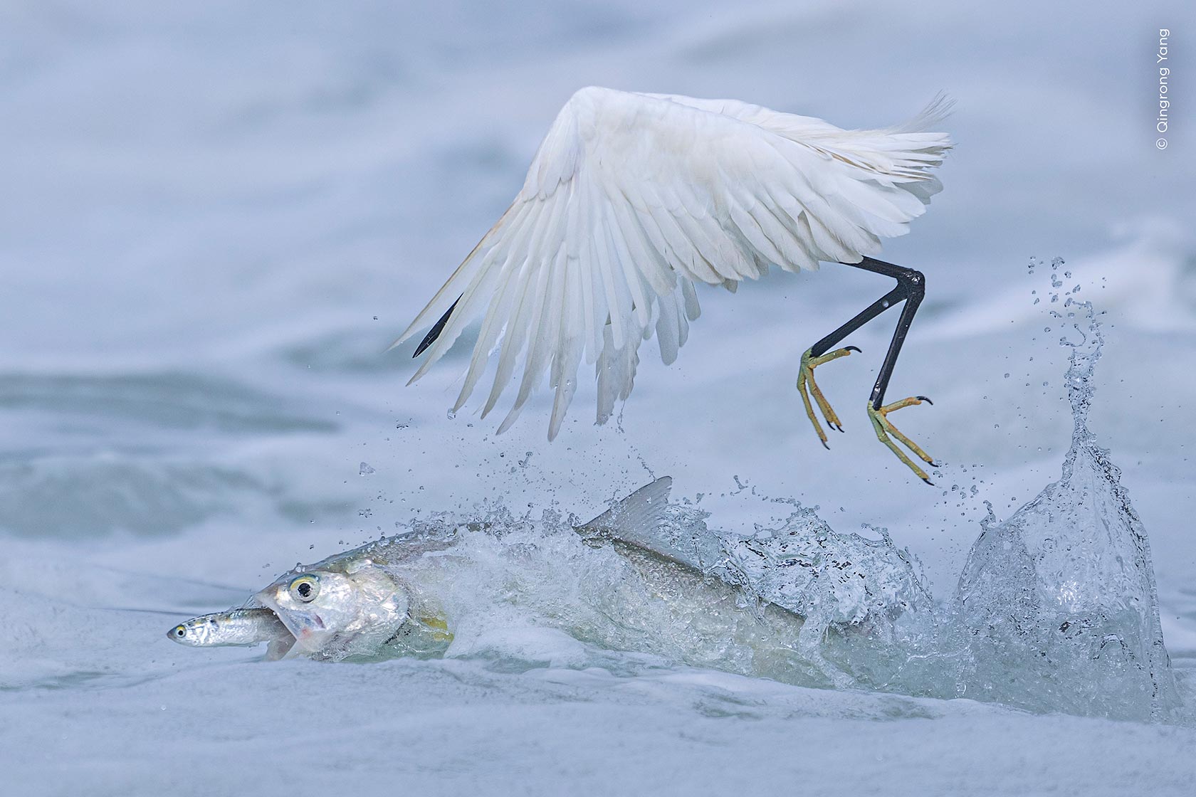 Когда удаётся поймать уникальный, редкий момент — это всегда большая радость. Когда этот момент почти невозможно повторить — приятно вдвойне. Работа Synchronised Fishing (Синхронная рыбалка) как раз идеальный пример. Получился некий вариант матрёшки с моралью: «Кто успел — тот и съел». Признаться, сначала мне показалось, что на снимке всё хорошо, но очень уж не хватает головы цапли. Но, рассмотрев работу внимательнее, понял — пожалуй, скрытые эмоции за крыльями, наоборот, добавляют драматизма моменту охоты, как будто птица просто не может поверить в такую несправедливость и со словами: «Всё, тушите свет!» — устраняется.