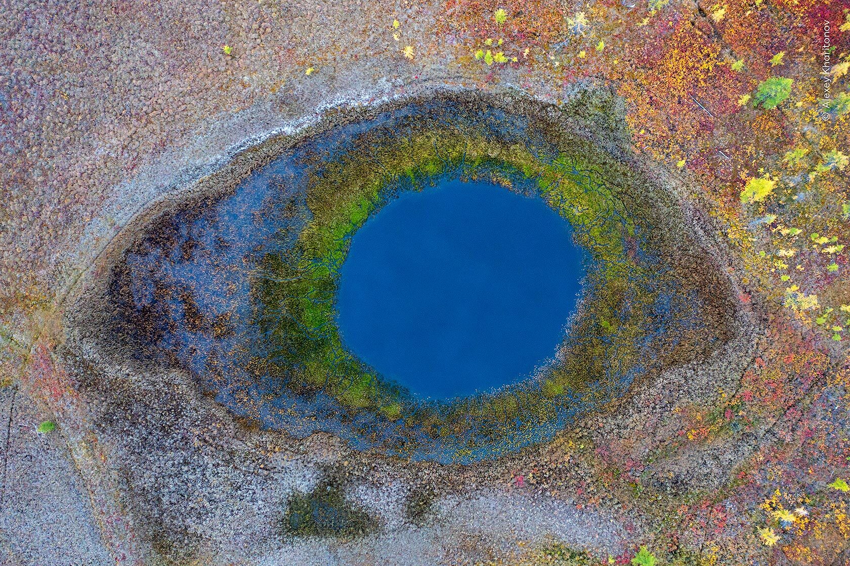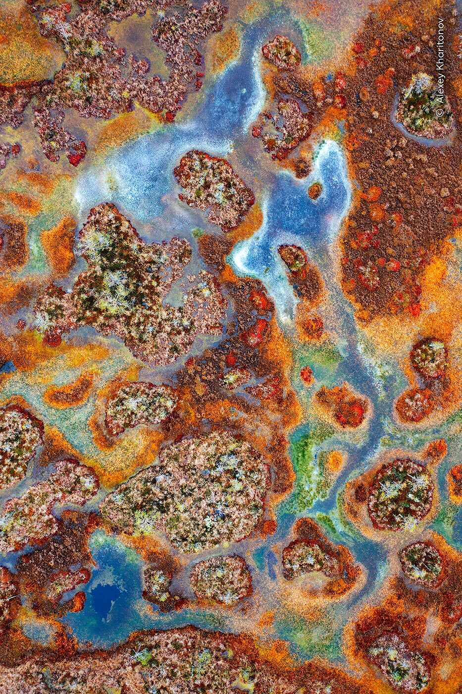 Второй кадр Алексея, который очень мне понравился и который является полной противоположностью первого. Насыщенные цвета, невероятное разнообразие. Сначала смотришь на кадр и не понимаешь, это макрофотография где-то под ногами или это снято с воздуха на дрон, и лишь высохшие болотные сосны дают ответ. Очень красивая и абстрактная фотография.