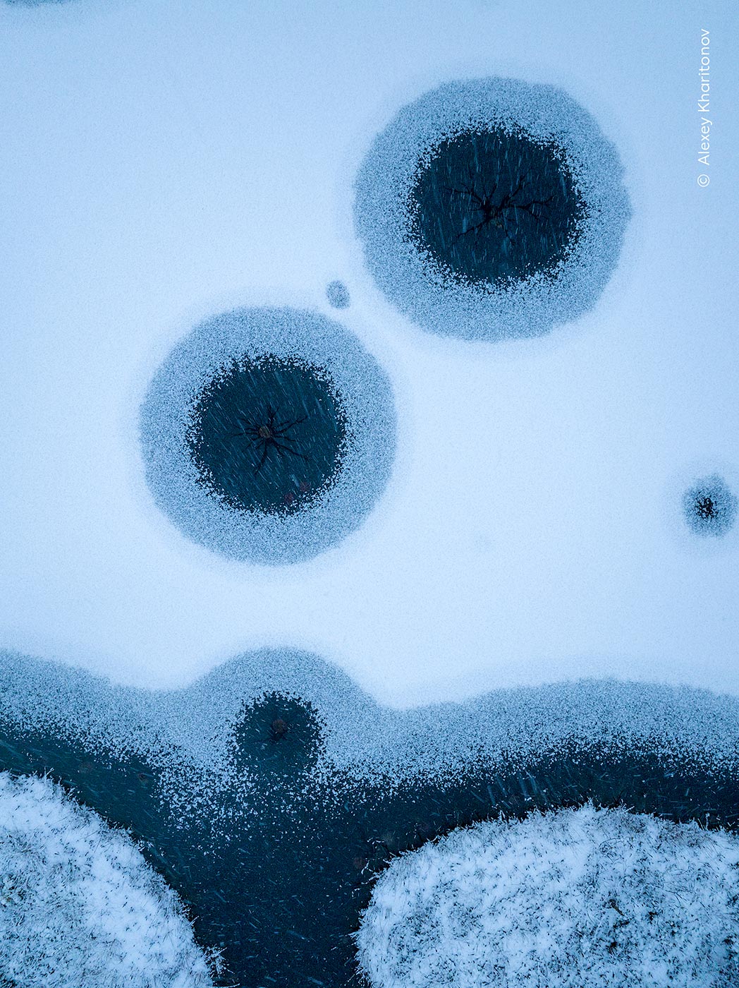 У Алексея мне очень понравились две фотографии. Это первая из них. Приятный монохромный цвет, снегопад, удивительные круги на льду, которые отлично сочетаются друг с другом по размеру. Несмотря на кажущуюся простоту, невероятно сложно с воздуха собрать гармоничную композицию.