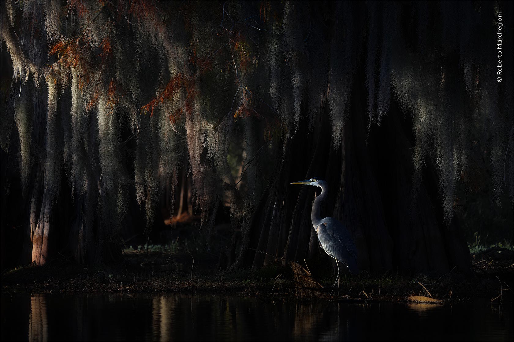 Очень атмосферная и завораживающая работа. Кажется, что цапля находится в неком иллюзорном пространстве, зыбком и волшебном. Тонкий луч света подчёркивает силуэт цапли и зажигает золотой всполох в её глазах. Мягкие гроздья мха, свисающего с ветвей, придают изображению объём и текстуру. И в какой-то момент начинает хотеться прикоснуться к ним.