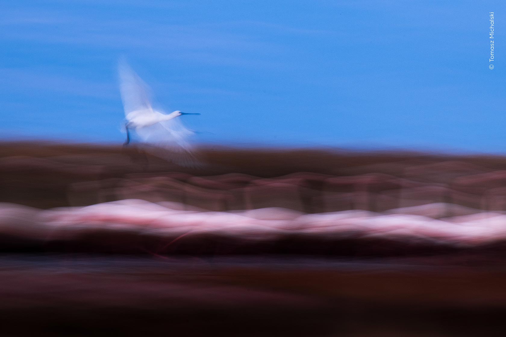 Этот кадр — элегантная абстракция. Взмах крыльев, движение над стаей фламинго — это почти балет, но ощущение натурализма не теряется: вид, среда, стая. Работа показывает, что борьба за выживание не всегда идёт через насилие — иногда это доминантность, отличие, обращение внимания и конкуренция в других формах.