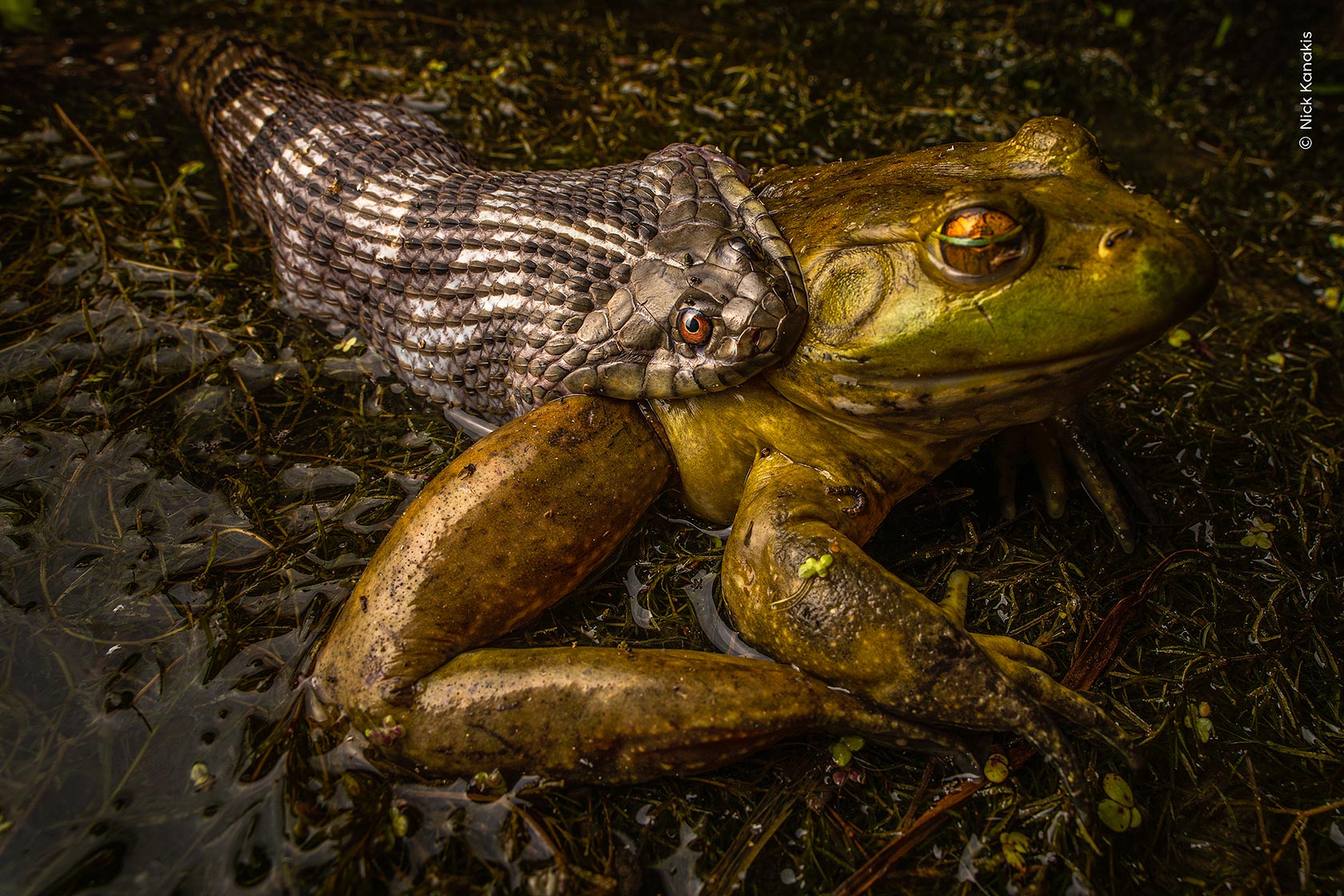 Фотографии из шорт-листа я смотрел на большом мониторе, и когда открылась эта — поразился необычности ракурса. Лягушка показалась огромной, и, выяснив её вид, я узнал, что она действительно достигает 20 сантиметров в длину и весит до 800 граммов. Автору удалось передать и этот аспект жизни ночных хищников.