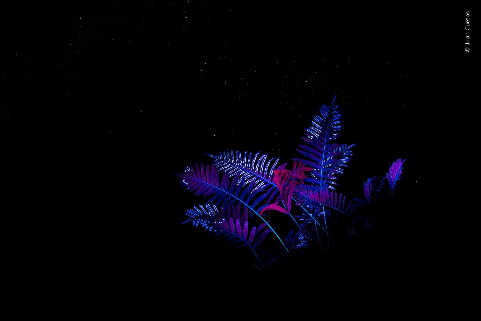 Красивая ночная фотография с ультрафиолетовой подсветкой. Добавление звёзд создаёт ощущение иного мира, словно съёмка велась не на Земле, а где-то ещё. Кадр лаконичен, без лишних деталей, с гармоничным сочетанием цветов.